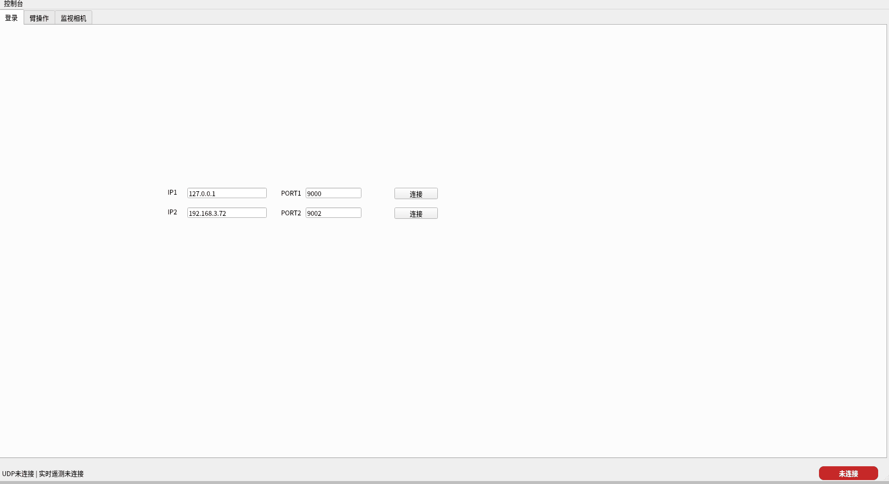 pushButton用ui_console/mainwindow.ui:33和ui_console/mainwindow.ui:46发起 UDP 握手,失败会弹窗;实时帧按协议解析后刷新双臂界面并写log.txt;pushButton_3发送参数请求,收到后更新按需页并写log_request.txt;pushButton_4请求 4 路图像,支持分片接收、缺片重传、CRC 校验,最后分别落到 left/、right/、scene1/、scene2/ 并显示在相机页标签上。结构定义和协议收发接口在
